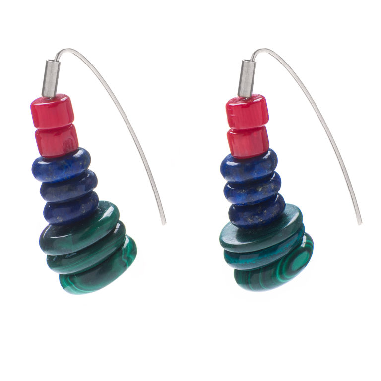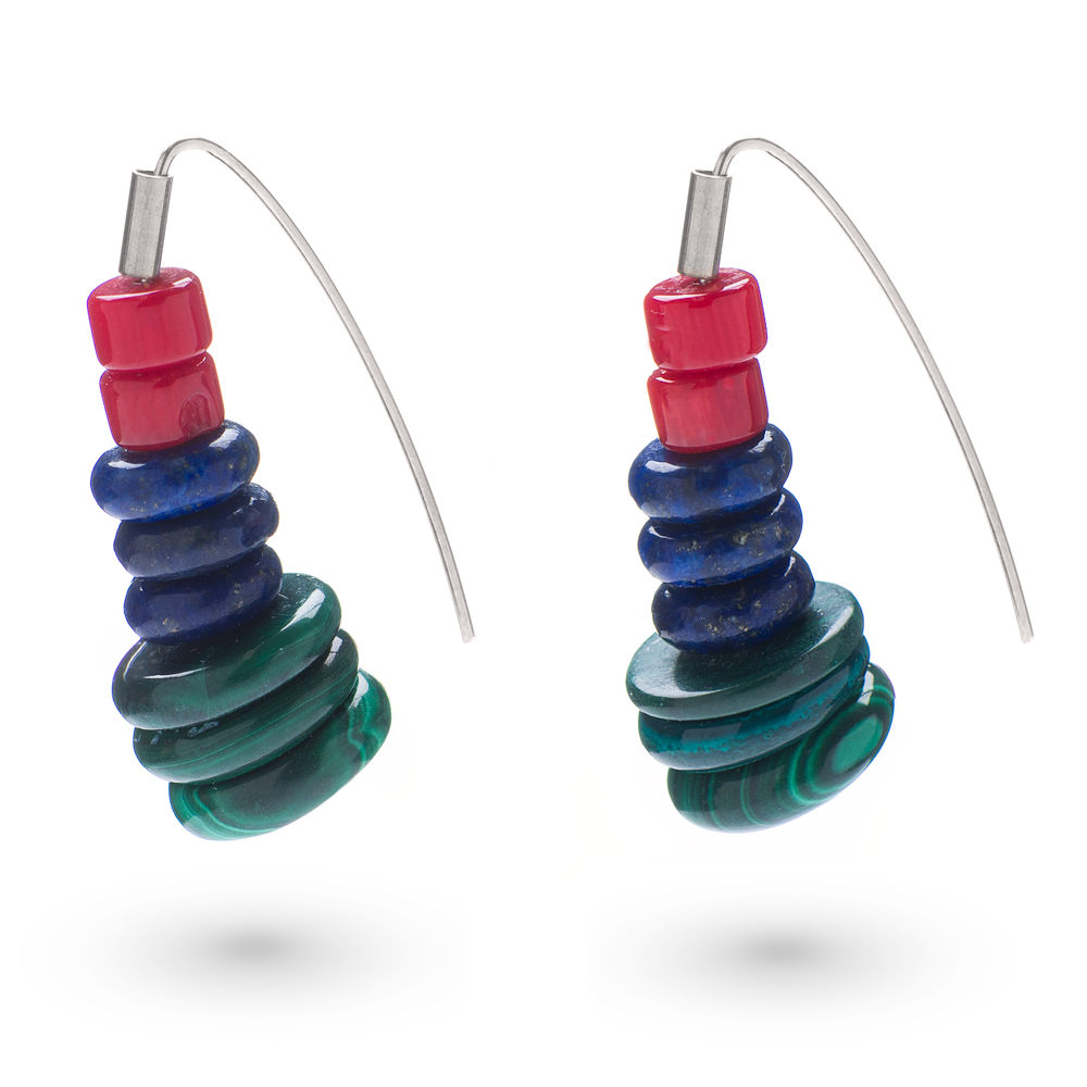 Deadly composition of silver 925 and three minerals – malachite, lapis lazuli and coral. A lighter version of Currara earrings but of the same qualities.