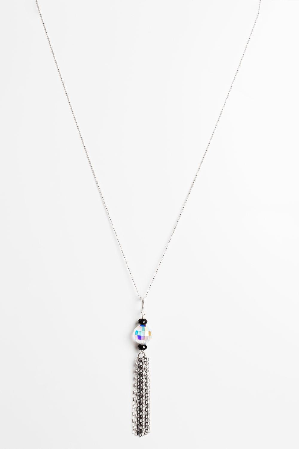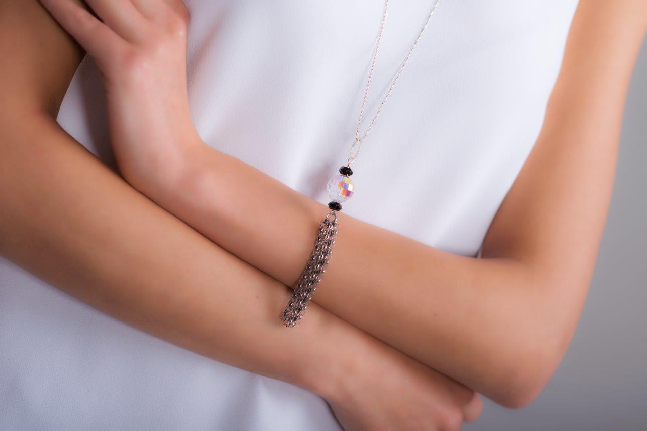Probably one of the most spectacular necklaces here. Long, stylish and spectacular. Crystal Clear entirely made of silver 925 and Swarovski crystal accompanied by two black onyx beads. Finished with a partly oxidised tassel of silver chain. Unforgettable.